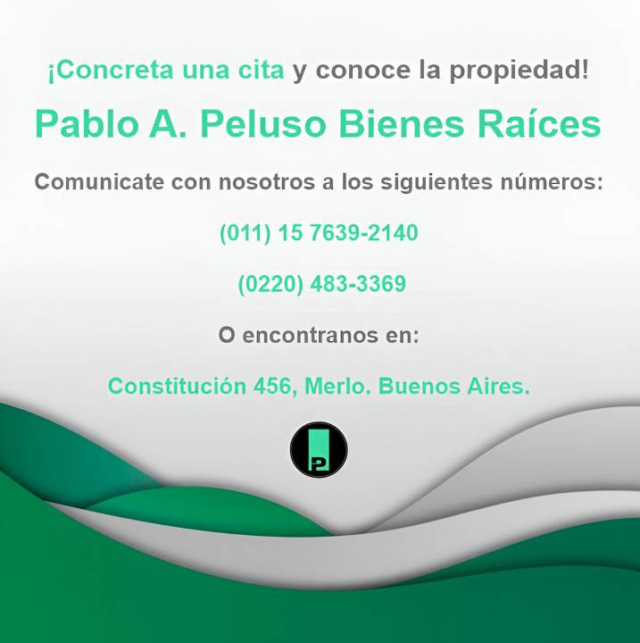 AVISO LEGAL IMPORTANTE: las operaciones inmobiliarias llevadas a cabo por Pablo A. Peluso Bienes Raíces, son objeto de intermediación por parte del Tasador, Martillero Público y Corredor Pablo Andrés Peluso con Mat. 316 del D. J. M. G. R. La descripción del inmueble, medidas y precio informado, son de carácter indicativo y provistas por la parte mandante, la información final quedará reflejada en su respectivo título o instrumento privado. Las imágenes y vídeos presentados tienen un carácter puramente ilustrativo y no generan acuerdo contractual.
